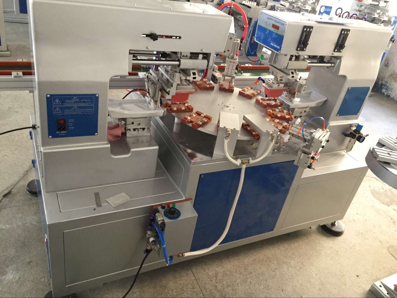 1、 印刷速度比轉(zhuǎn)盤機(jī)慢,但印刷工件可以大一些,四個顏色一次套色印刷完成。