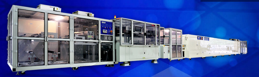 面板印刷過(guò)后由吸盤式機(jī)械臂吸取由精密滑軌移出臺(tái)面,到自動(dòng)出料段放置在交叉式防靜電輪片上輸送到下一段烘干制程。